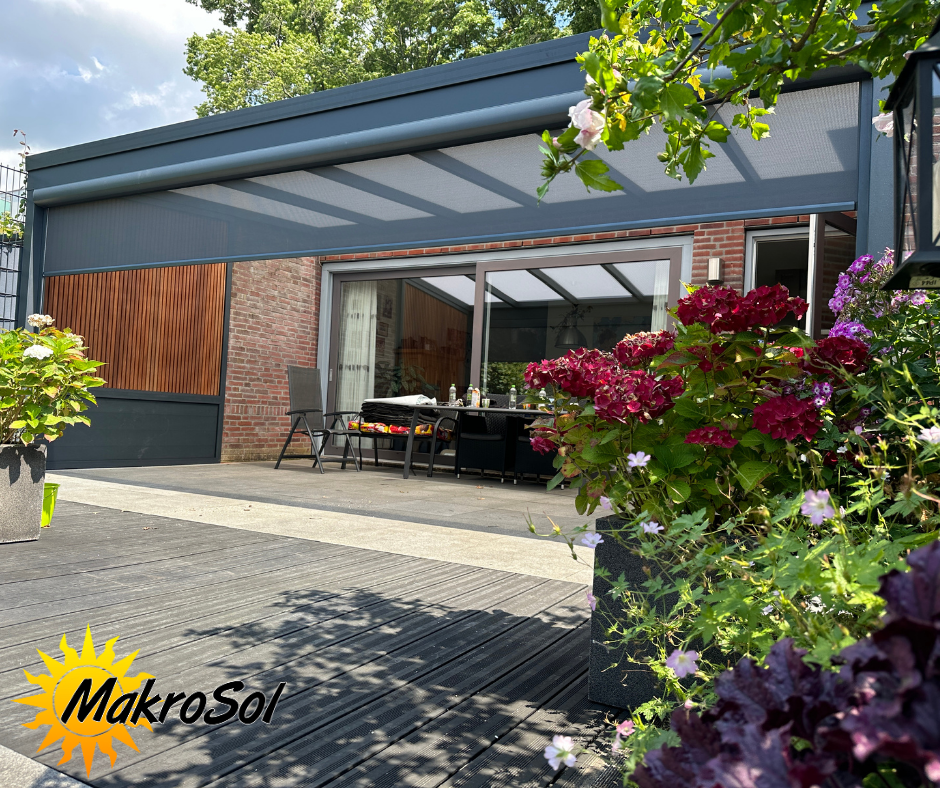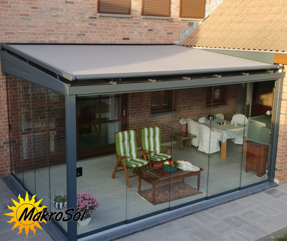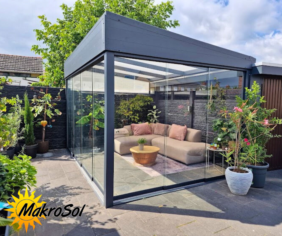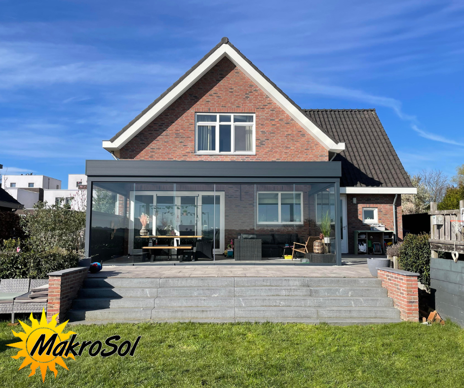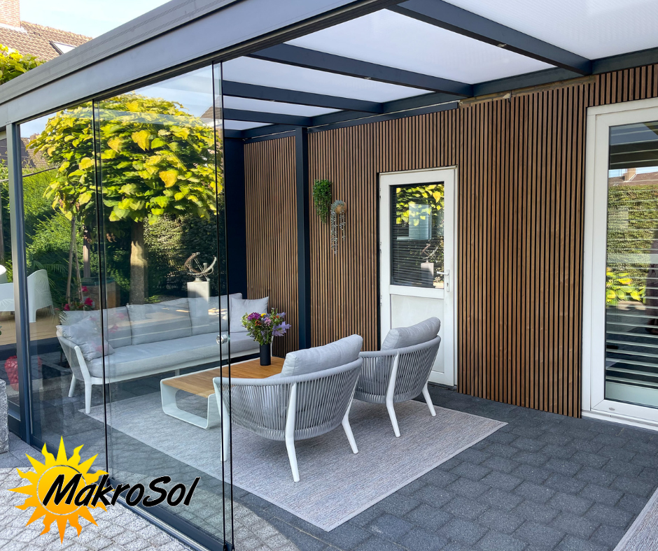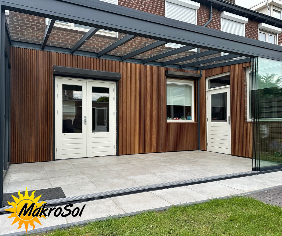 Met de glazen schuifwanden van MakroSol kunt u uw overkapping afsluiten, zodat u nog langer kunt genieten van het buitenleven, ongeacht het seizoen.