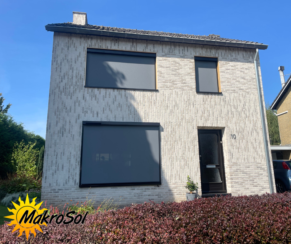 De aluminium steunen zijn verkrijgbaar in alle RAL-kleuren, terwijl het screendoek van glasvezel zowel zonlicht als warmte tot 88% reflecteert, zonder het zicht naar buiten te belemmeren. Er zijn diverse weefselstructuren en kleuren beschikbaar, met een maximale breedte van 6 meter.